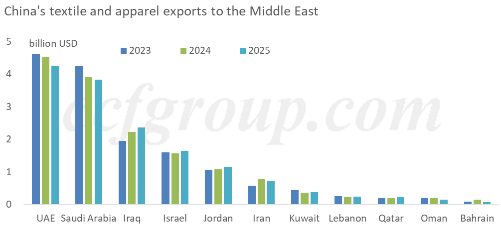 2025 China textile & apparel exports to major Middle East countries (Value & Share)