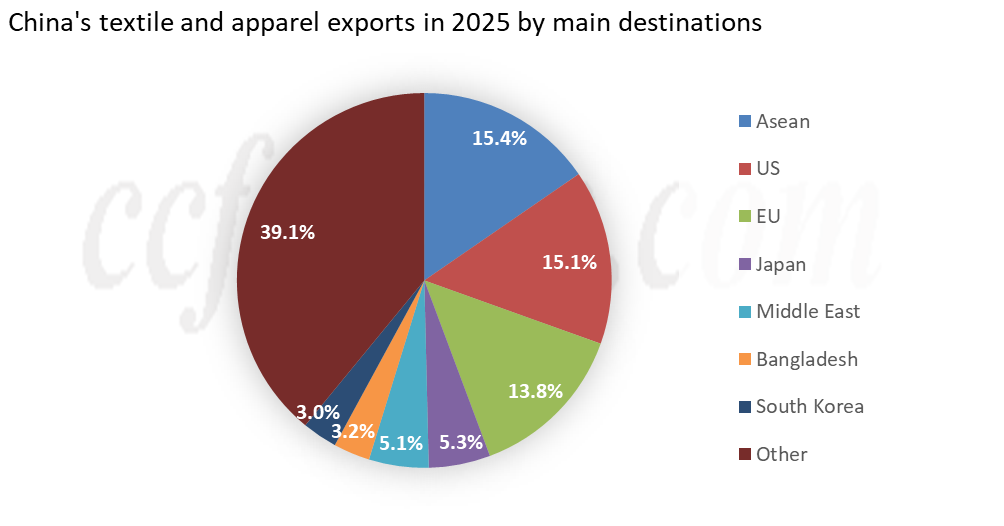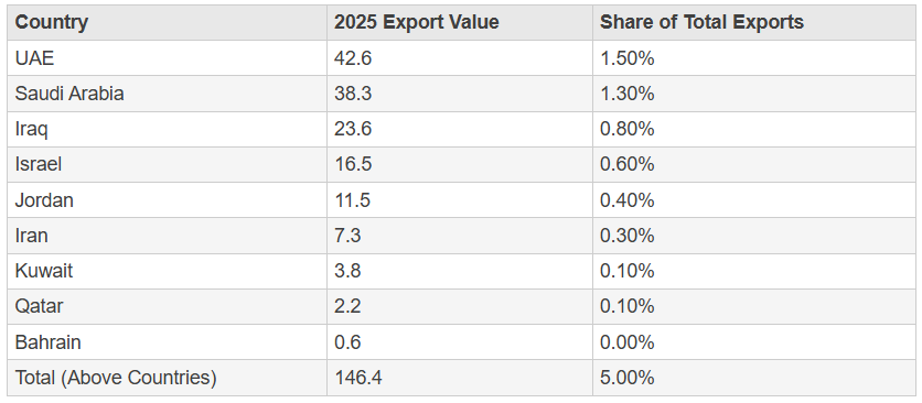 For China, textile and apparel exports to the Middle East account for around 5% of total exports, with limited fluctuations in recent years. The 11 major Middle Eastern countries mentioned represent export values of approximately USD 15.0–15.2 billion, slightly above 5% of China's total textile and apparel exports. The largest shares go to the UAE and Saudi Arabia, followed by Iraq and Israel, then Jordan and Iran, while other countries account for relatively smaller proportions.