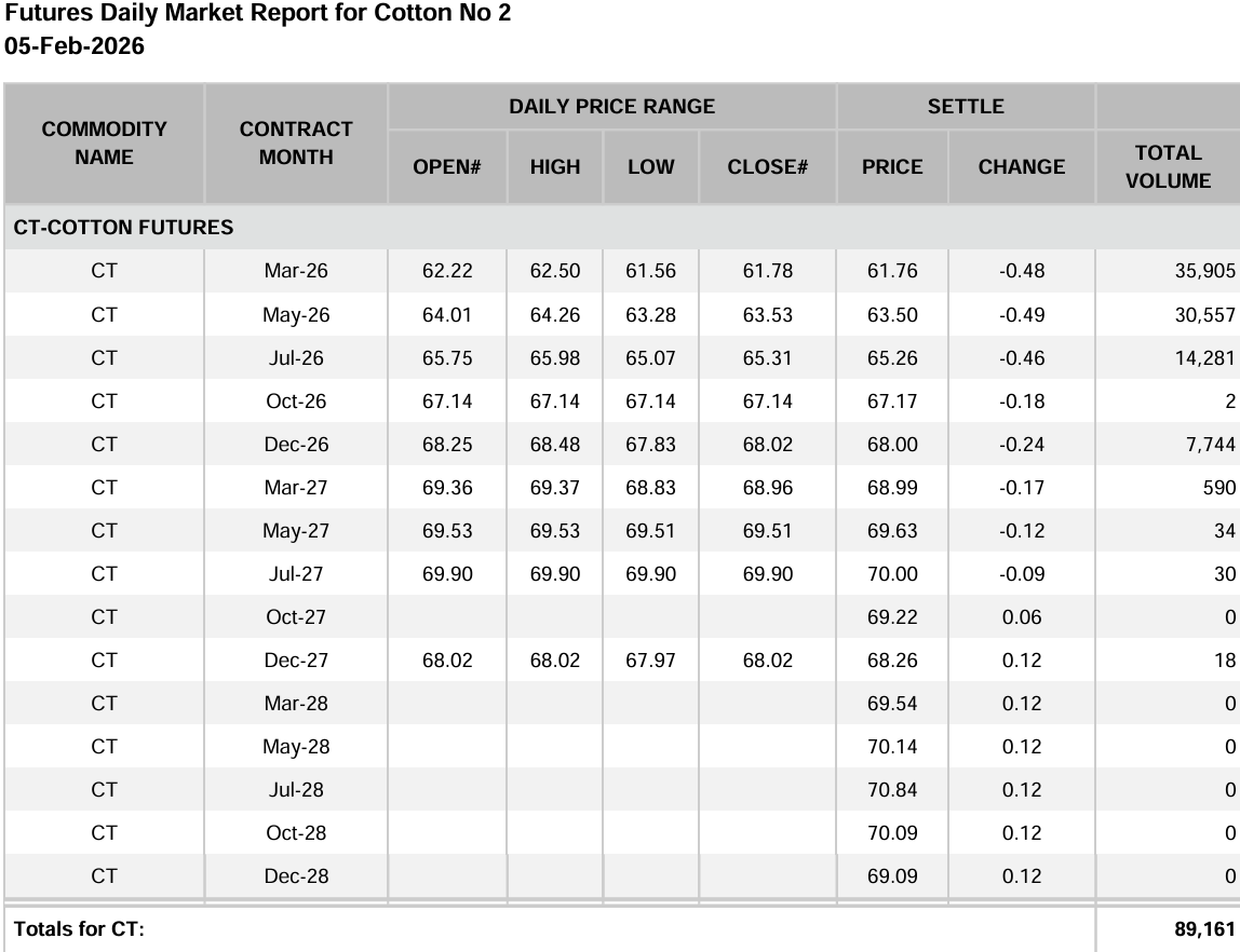 February 6, 2026 ICE Futures February 05 A- A+ February 05, 2026: Cotton Futures EUR/US$ 1.1798 Tags cotton futures cotton prices ICE Futures