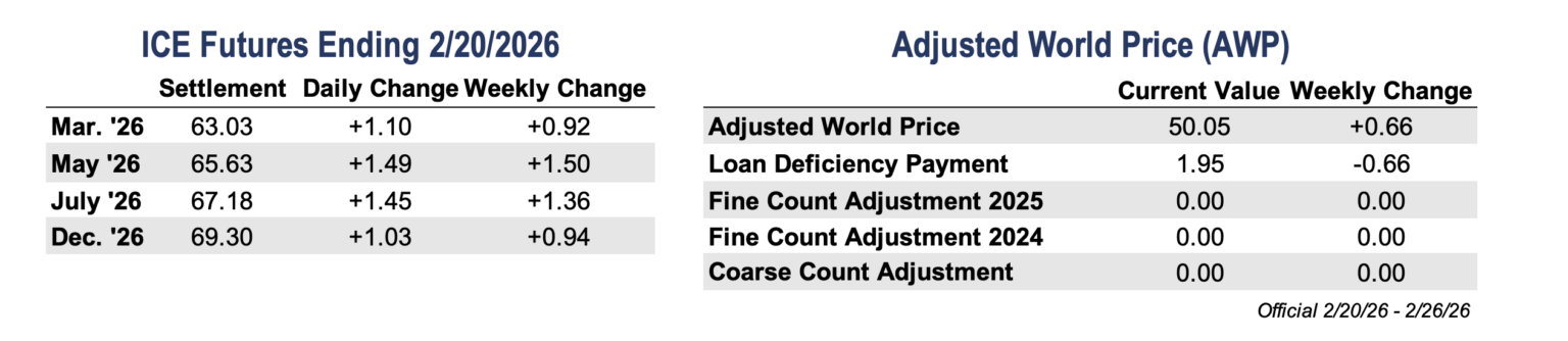 • Figures from the USDA Agricultural Outlook Forum offered some support to the market, with early projections pointing to slightly tighter balance sheets in both the U.S. and globally. For 2026/27, U.S. planted acreage was estimated at 9.4 million acres, above last year’s 9.28 million and higher than the National Cotton Council’s recent estimate of 8.99 million acres. Production was projected at 13.6 million bales, with exports at 12.2 million bales and ending stocks at 4.2 million bales, slightly below the current marketing year.