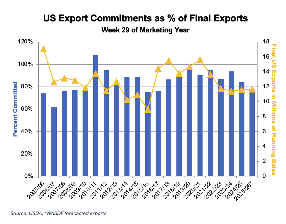 • Export sales pulled back from the previous week’s marketing-year high but remained solid overall for the latest reporting period. Net Upland sales totaled 253,200 bales, with an additional 29,700 bales booked for the next marketing year, while Pima sales reached 15,200 bales. Shipments remained light at 193,000 Upland bales and 4,200 Pima bales, continuing to run below the pace needed to reach USDA’s 12 million bale export projection. Total commitments now stand at 77% of the expected final total, still well below the five-year average, indicating the U.S. will need stronger shipments and continued sales in the weeks ahead.