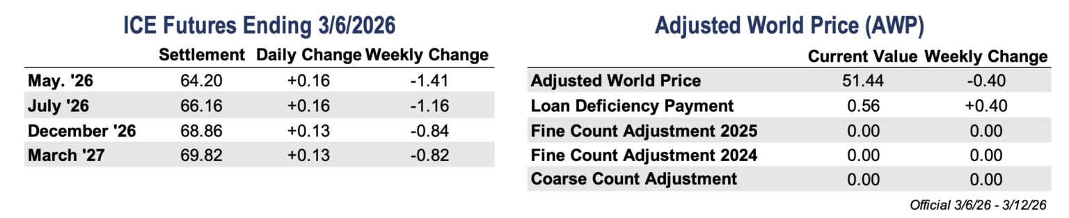 - Overall, the week is relatively light on major economic releases but still heavy on policy and global headlines. The focus has shifted toward how much of the Iranian risk markets will need to absorb, with price direction likely to follow developments as the situation unfolds. Updated cotton supply and demand estimates are due next Tuesday, followed by the March Prospective Plantings Report at the end of the month.