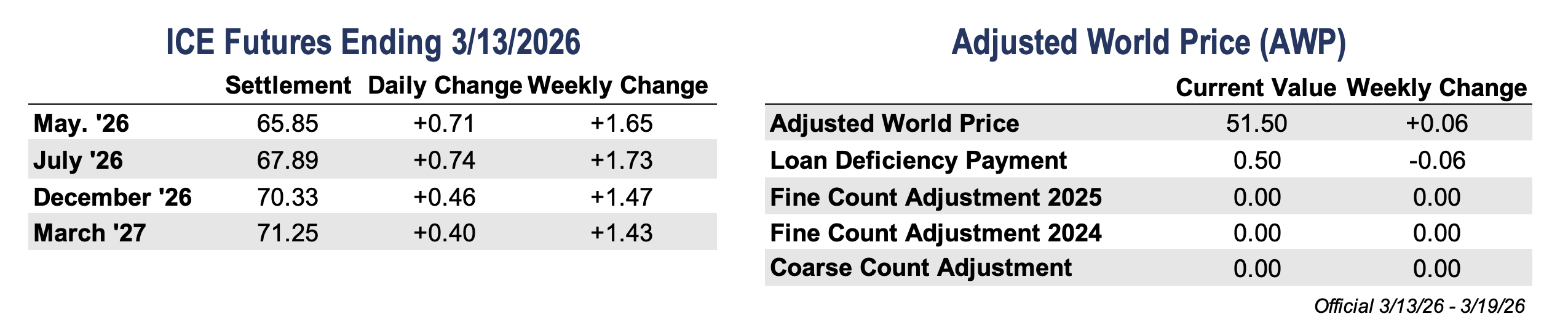 • Cotton futures posted modest gains this week as markets navigated continued volatility across the broader macro landscape. May futures finished the week 165 points higher, settling at 65.85 cents per pound, after trading in a relatively narrow range compared to the large swings seen in energy and financial markets.