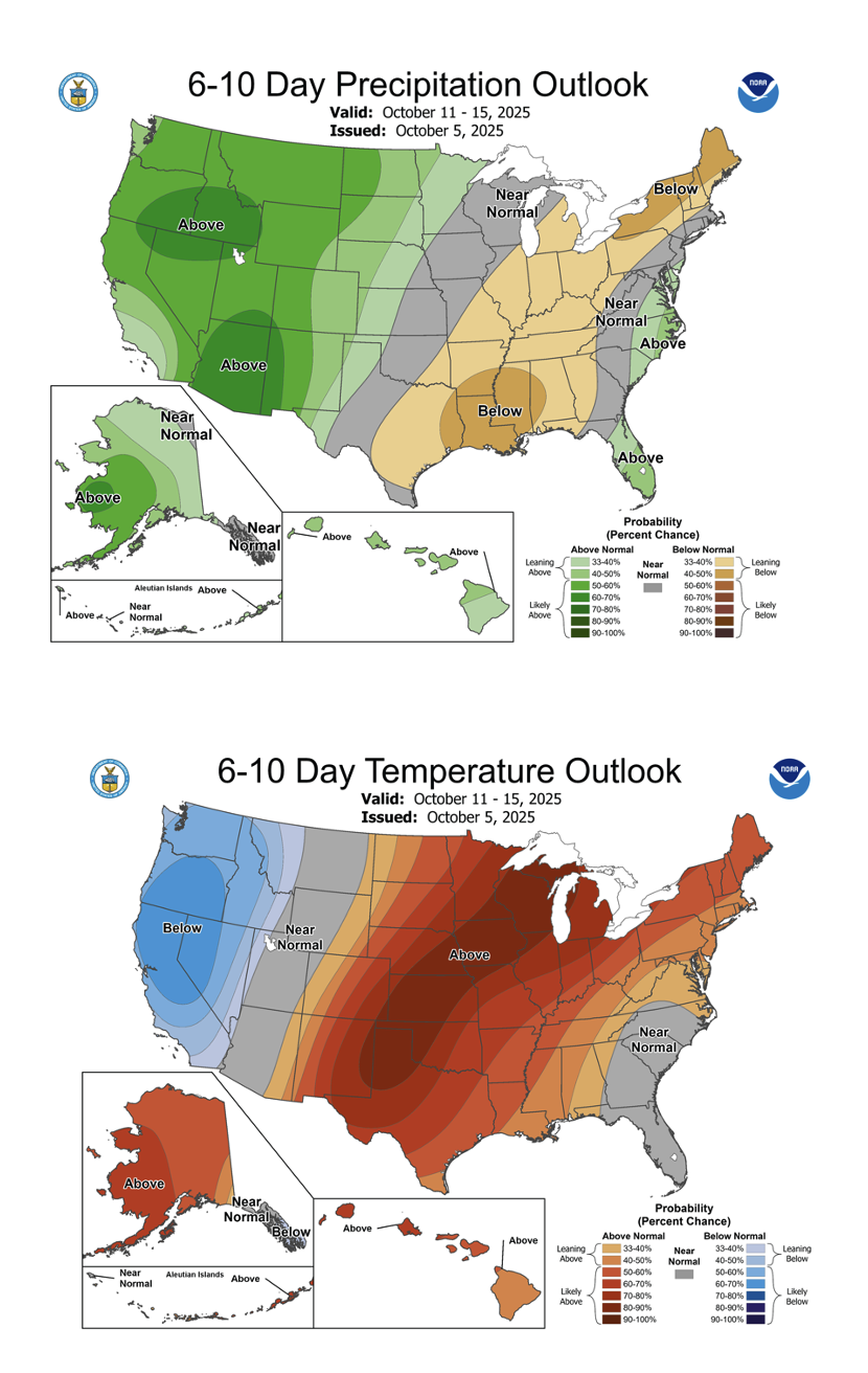 • Southwest crop conditions remain mostly favorable. For the week ending September 28, Oklahoma was the only state to see improvement, rising to 71% good to excellent, while Texas held at 41% and Kansas slipped to 50%. Boll opening has advanced to 57% in Texas, 70% in Oklahoma, and 26% in Kansas. Harvest is winding down in South Texas, bringing the statewide total to 26%. Although no updated Crop Progress and Condition Report will be released this week, harvest is underway in West Texas and Oklahoma, with Kansas not far behind.