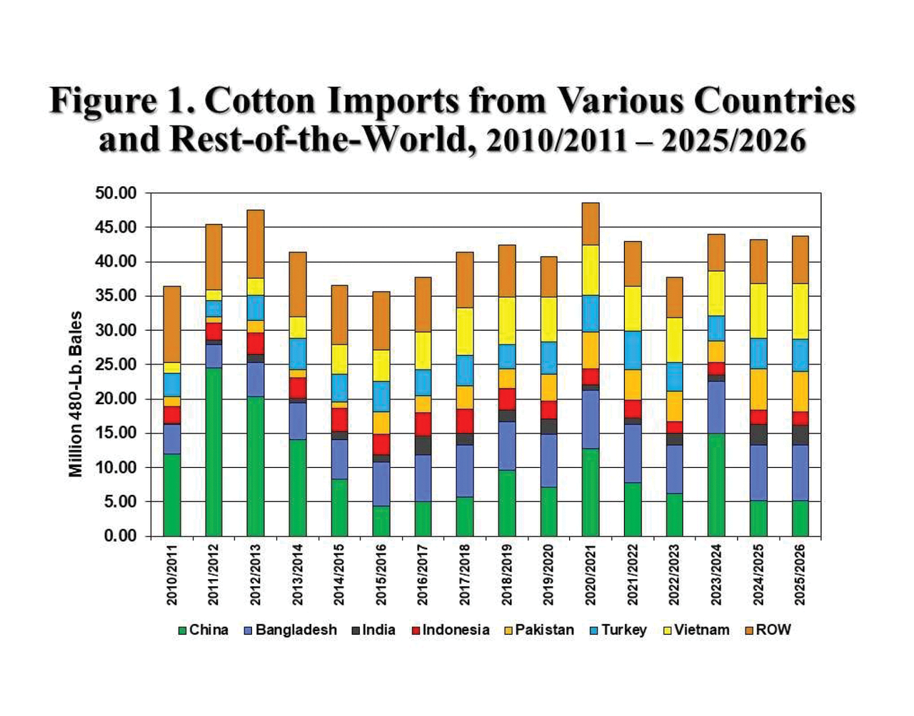 The stacked bar chart shows a historical breakdown of imports of all U.S. cotton (i.e., Upland and Pima combined) and identifies the top exporters of U.S. cotton. This includes China, and then, alphabetically: Bangladesh, India, Indonesia, Pakistan, Turkey, Vietnam, and the rest of the world combined.