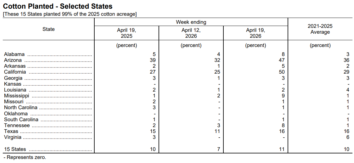 April 21, 2026 USA Cotton: Crop Progress A- A+ Released April 20, 2026, by the National Agricultural Statistics Service (NASS), Agricultural Statistics Board, United States Department of Agriculture (USDA). Source: USDA-NASS Tags USA Crop Progress