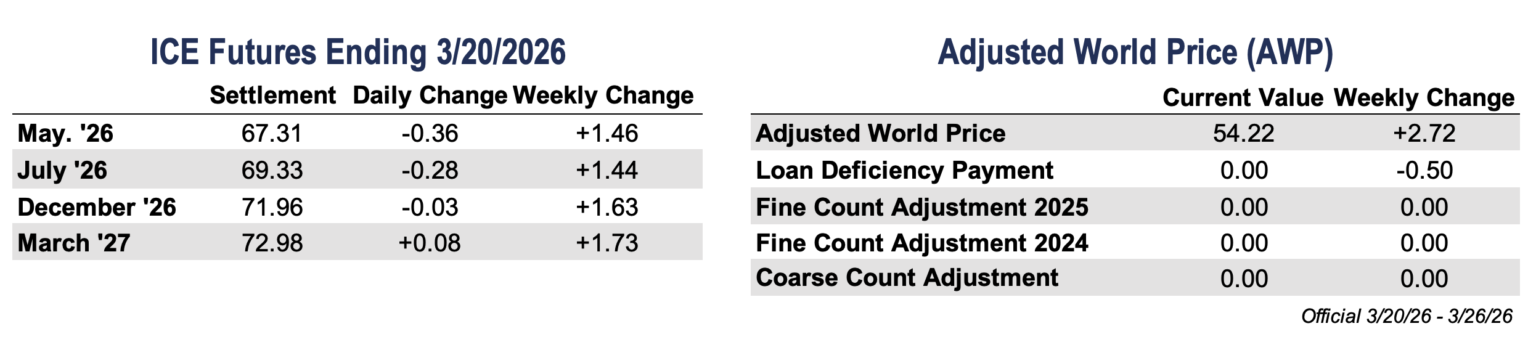 - Cotton futures pushed higher early in the week before giving back some gains into Friday, ultimately finishing modestly higher overall. May futures settled at 67.31 cents per pound, up 146 points on the week, after reaching their highest levels since July 2025 and briefly breaking above the 200-day moving average.
