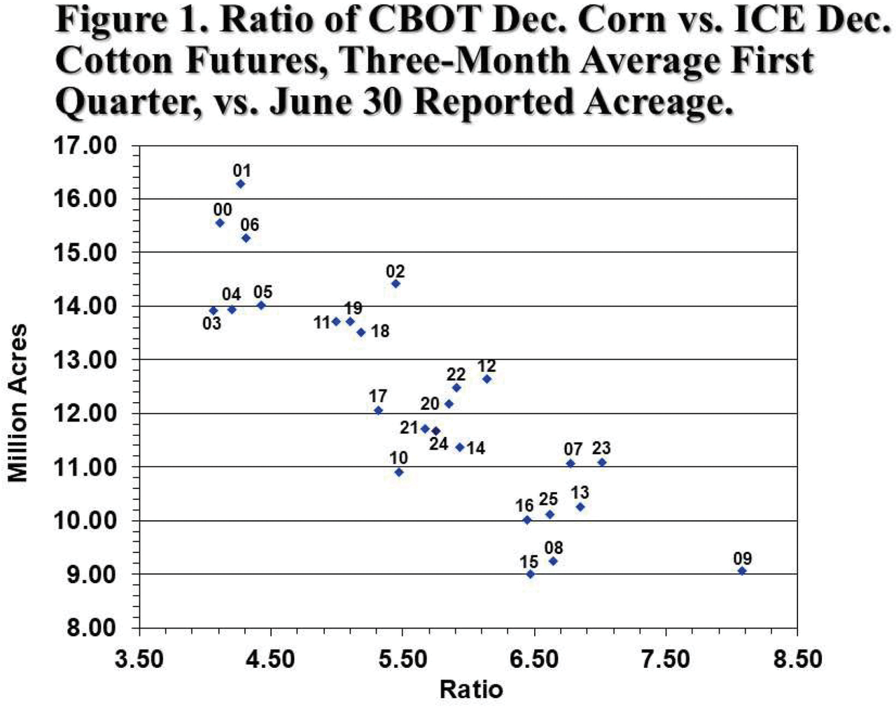 One major influence on U.S. cotton plantings is relative prices of alternative crops. For example, U.S. cotton acreage varies inversely with the ratio of December 2026 Chicago Board of Trade corn futures to December 2026 ICE cotton futures in the first quarter of the year (Figure 1). Based on the most recent levels of that price ratio, we might expect around 10 million acres of U.S. Upland and Pima combined. That represents little change over what U.S. growers planted in 2025, although the distribution might vary with more planted in the eastern Cotton Belt and more in Kansas, Oklahoma and Texas.