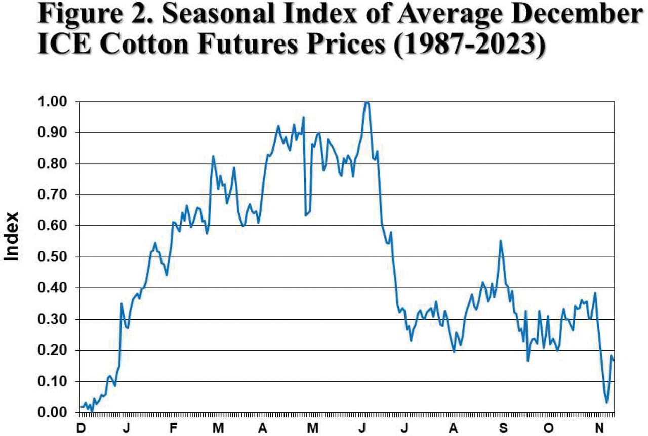 So where does that leave the price out­look? On average, the harvesttime ICE December contract rises during the first half of the year and downshifts in the second (Figure 2). Following the historical pattern, December 2026 ICE cotton could make a run at the mid- to upper 70s, espe­cially with low plantings and high aban­donment.
