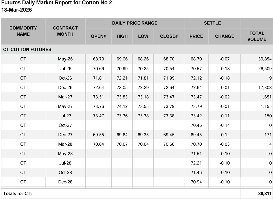 19 Μαρτίου 2026 ICE Futures March 18 A- A+ Το περιεχόμενο του άρθρου δεν είναι διαθέσιμο στη γλώσσα που έχετε επιλέξει και ως εκ τούτου το εμφανίζουμε στην αυθεντική του εκδοχή. Μπορείτε να χρησιμοποιήσετε την υπηρεσία Google Translate για να το μεταφράσετε. March 18, 2026: Cotton Futures EUR/US$ 1.1500 Tags cotton futures cotton prices ICE Futures
