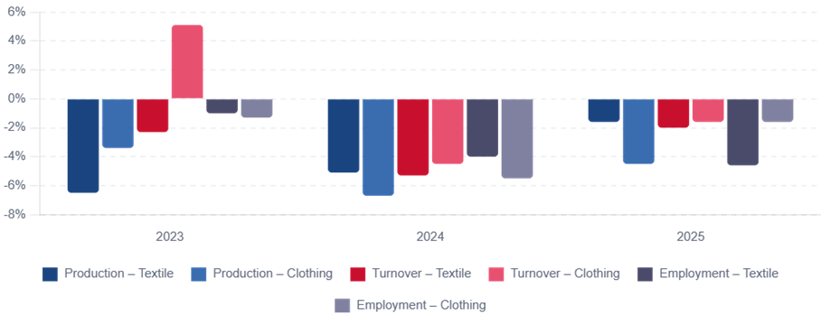 EURATEX has released its latest Economic Update on the performance of the European textile and apparel industry in 2025. For the third consecutive year, the sector recorded negative results across all key indicators — production, turnover and employment — confirming a continued erosion of competitiveness across Europe.