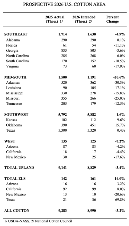 MEMPHIS, Tenn. – U.S. cotton producers intend to plant 9.0 million cotton acres this spring, down 3.2 percent from 2025, according to the National Cotton Council’s 45th Annual Early Season Planting Intentions Survey. (see table attached)