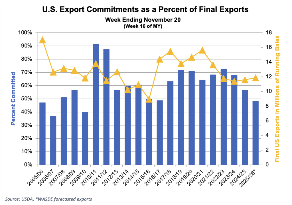 - The following week, ending November 20, net Upland sales eased to 148,400 bales, while shipments increased to 120,800 bales. Vietnam, Turkey, and Pakistan once again led weekly buying. Pima net sales came in at 6,200 bales, with shipments at 6,700 bales. Even so, total commitments and shipments remain behind the pace needed to reach USDA’s export projection of 12.2 million bales. USDA is still working through data delays tied to the government shutdown but is expected to be fully caught up with the Export Sales Report on January 8.