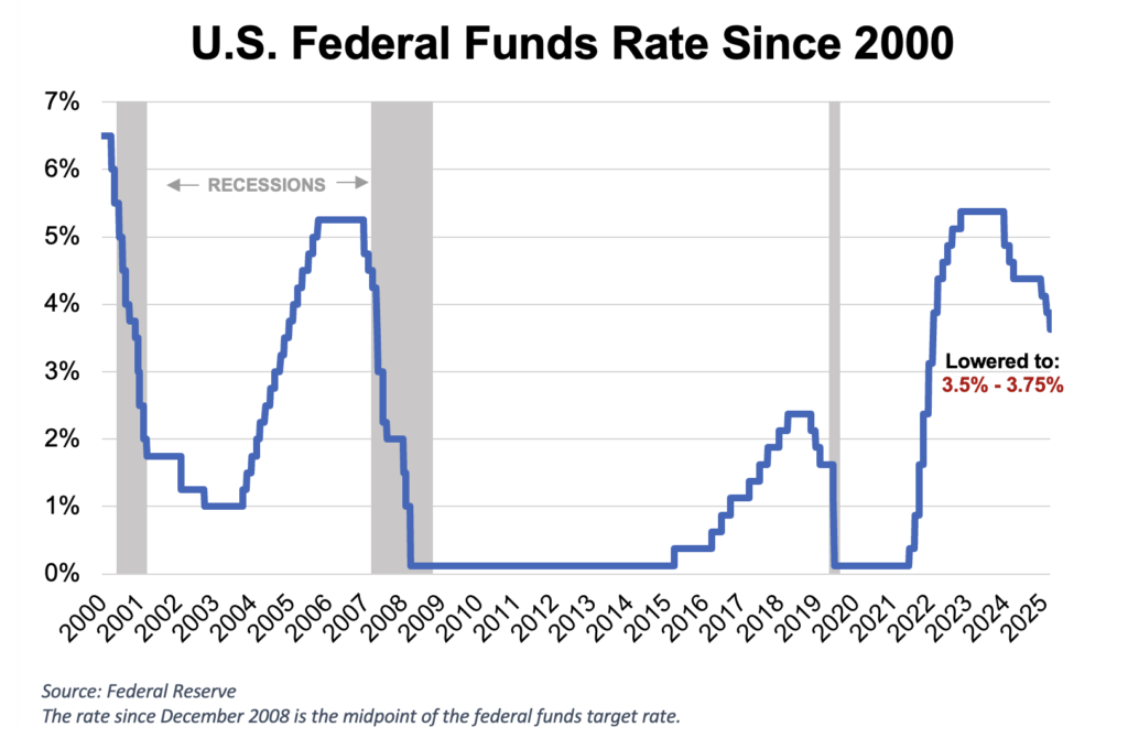 - The Fed delivered a third straight 25-basis-point rate cut last week, lowering the target range to 3.50–3.75% and striking a notably dovish tone. Chair Powell pointed to softening labor conditions and suggested recent payroll data may be overstated, while noting policy is now near neutral but still tilted toward easing. Markets responded quickly, with two-year yields posting their largest one-day drop in two months, the dollar sliding, and equities moving higher. Looking ahead, focus turns to this week’s delayed November payrolls and Thursday’s CPI, which could further shape expectations for additional rate cuts in 2026.