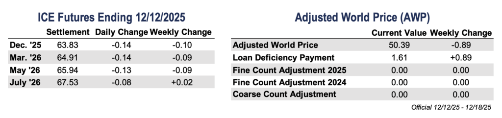 - Cotton-specific news remained limited, with much of the focus on shutdown-delayed reports still working their way through the system. Export Sales were mixed, and the December supply and demand report was largely taken in stride. Futures took little direction from outside markets despite a 25-basis-point Fed rate cut that supported equities, as cotton remained weighed down by steady selling. The tone stayed subdued throughout the week, with technicals still pointing to limited upside momentum. In a switch, speculators were net buyers for five consecutive weeks through November 18 based on the latest available data, which was delayed by the government shutdown, even as the market posted a contract low.