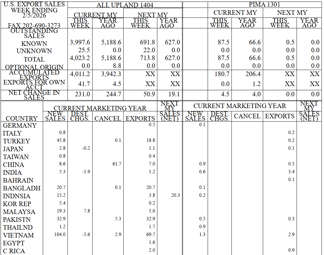 Cotton: Net sales of Upland totaling 231,000 RB for 2025/2026 were down 8 percent from the previous week and 23 percent from the prior 4-week average. Increases primarily for Vietnam (95,400 RB, including 1,900 RB switched from India, 200 RB switched from Japan, and decreases of 2,900 RB), Turkey (45,800 RB, including decreases of 100 RB), Pakistan (27,600 RB, including decreases of 5,300 RB), Malaysia (27,100 RB, including 7,800 RB switched from Vietnam), and Bangladesh (20,600 RB, including decreases of 100 RB), were offset by reductions for China (53,100 RB). Net sales of 50,900 RB for 2026/2027 were reported for unknown destinations (22,000 RB), Indonesia (20,300 RB), Mexico (8,500 RB), and Honduras (100 RB). Exports of 188,600 RB were down 20 percent from the previous week and 10 percent from the prior 4-week average. The destinations were primarily to Vietnam (69,700 RB), Pakistan (32,900 RB), Bangladesh (20,700 RB), Turkey (18,800 RB), and China (7,000 RB). Net sales of Pima totaling 4,500 RB for 2025/2026 were up 38 percent from the previous week, but down 70 percent from the prior 4-week average. Increases were primarily for Vietnam (1,300 RB), China (900 RB), Thailand (900 RB), India (600 RB), and Pakistan (500 RB). Exports of 8,300 RB were up noticeably from the previous week and up 26 percent from the prior 4-week average. The destinations were primarily to India (3,400 RB), Vietnam (2,900 RB), Costa Rica (900 RB), China (500 RB), and Pakistan (300 RB).
